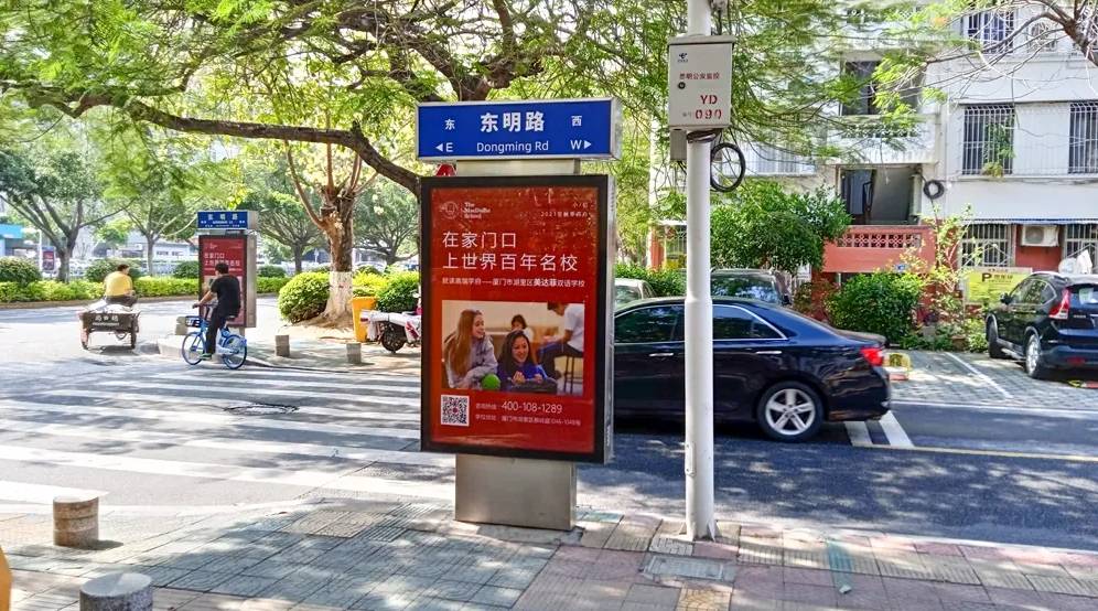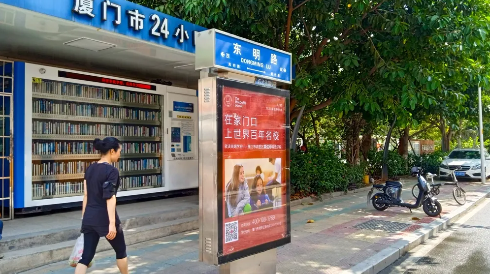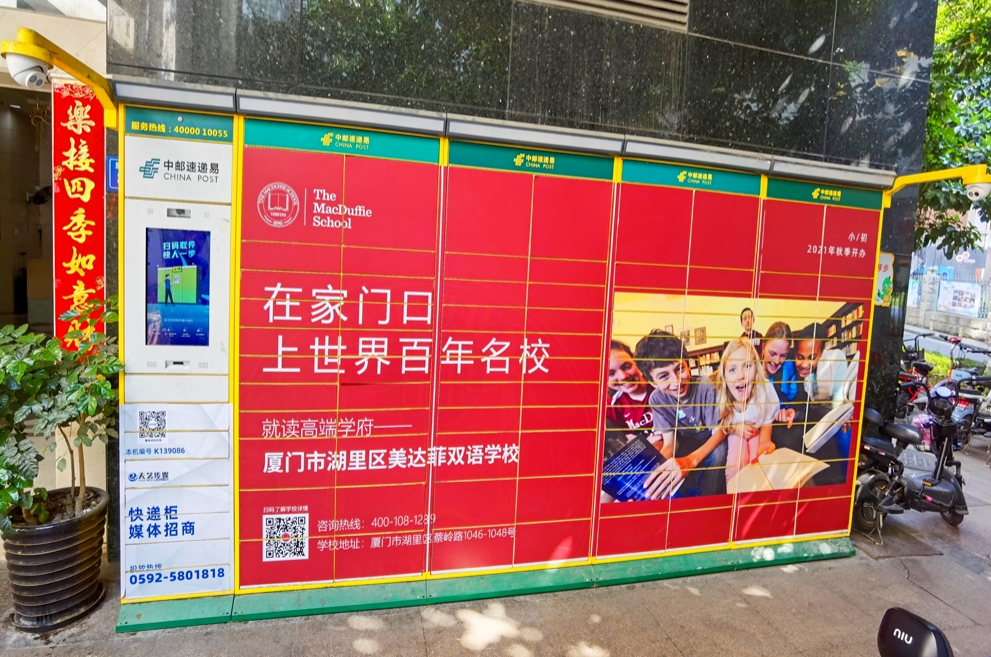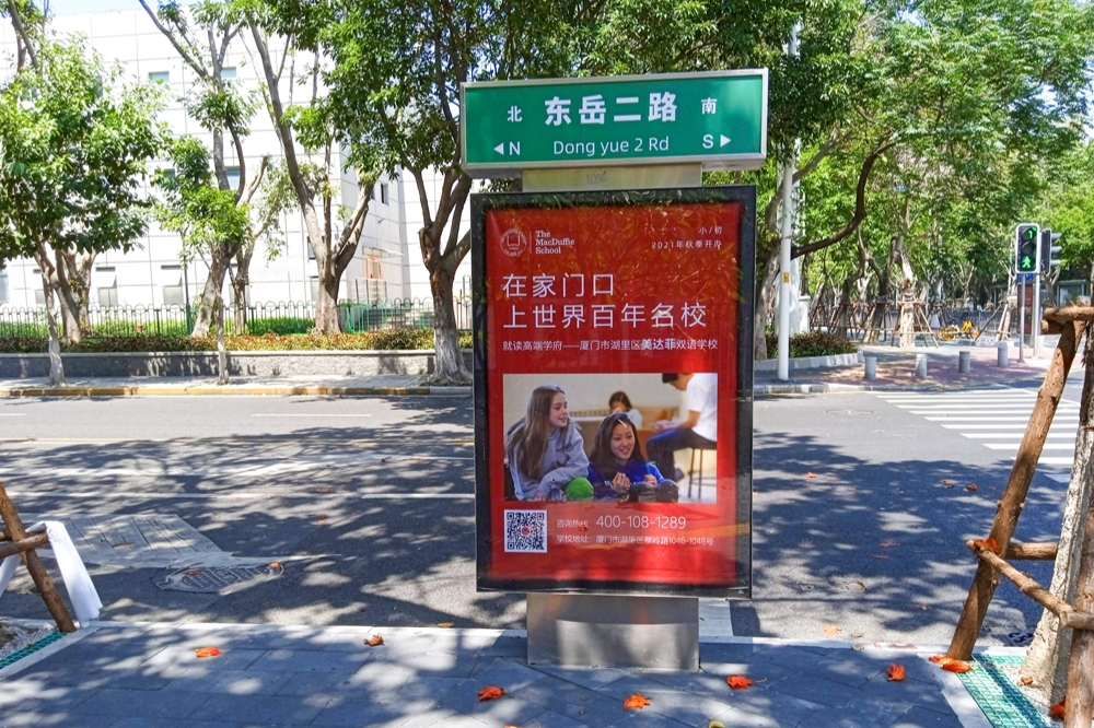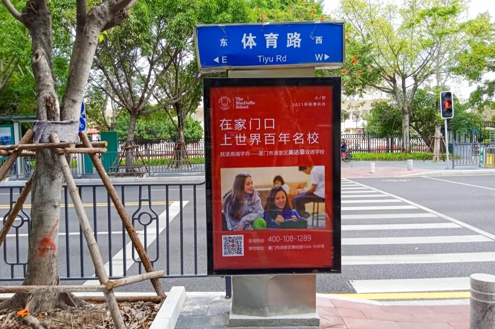 美達菲在廈門確定扎根后,重視線上線下的一系列宣傳告知,年后即開始在廈門戶外多個渠道進行大范圍的宣傳推廣,以“在家門口,上世界百年名校”為口號,集中在五緣灣、觀音山、會展、萬達廣場、蔡塘廣場等多個中高端商圈、商務圈,以及仙岳路、廈禾路、嘉禾路等多個主干道進行城市路名牌的投放,同時在島內(nèi)多個高端住宅小區(qū)的快遞柜進行大幅畫面展示。