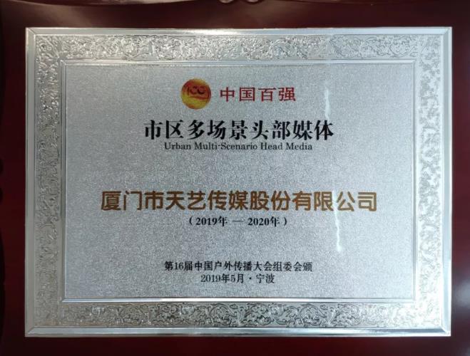 廈門市天藝傳媒股份有限公司創(chuàng)立于1993年,業(yè)務范圍覆蓋品牌管理、創(chuàng)意策劃、整合營銷、媒體投放等傳播鏈條。公司發(fā)展26年,在戶外傳媒領域極具市場競爭優(yōu)勢,形成了城市路名牌、公交候車亭、站名牌、廈門國際郵輪中心媒體、廈門航空艙內(nèi)媒體、廈門機場手推車、網(wǎng)約車媒體等“海·陸·空”360°全媒體覆蓋。在此次會議中,廈門市天藝傳媒股份有限公司有幸榮獲《中國百強市區(qū)多場景頭部媒體》的獎項。